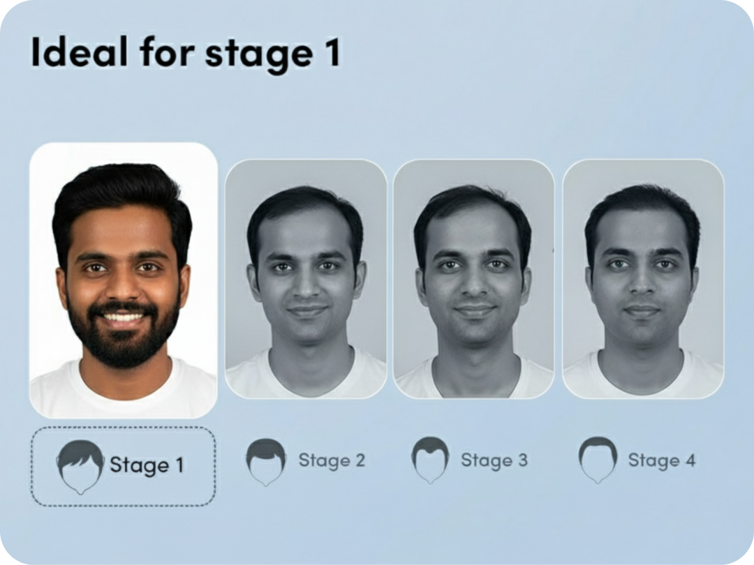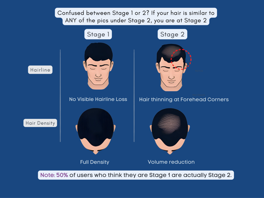 Stage 1 is when you are experiencing hair thinning of around 100 strands per day for less than 1 year but no receding hairline