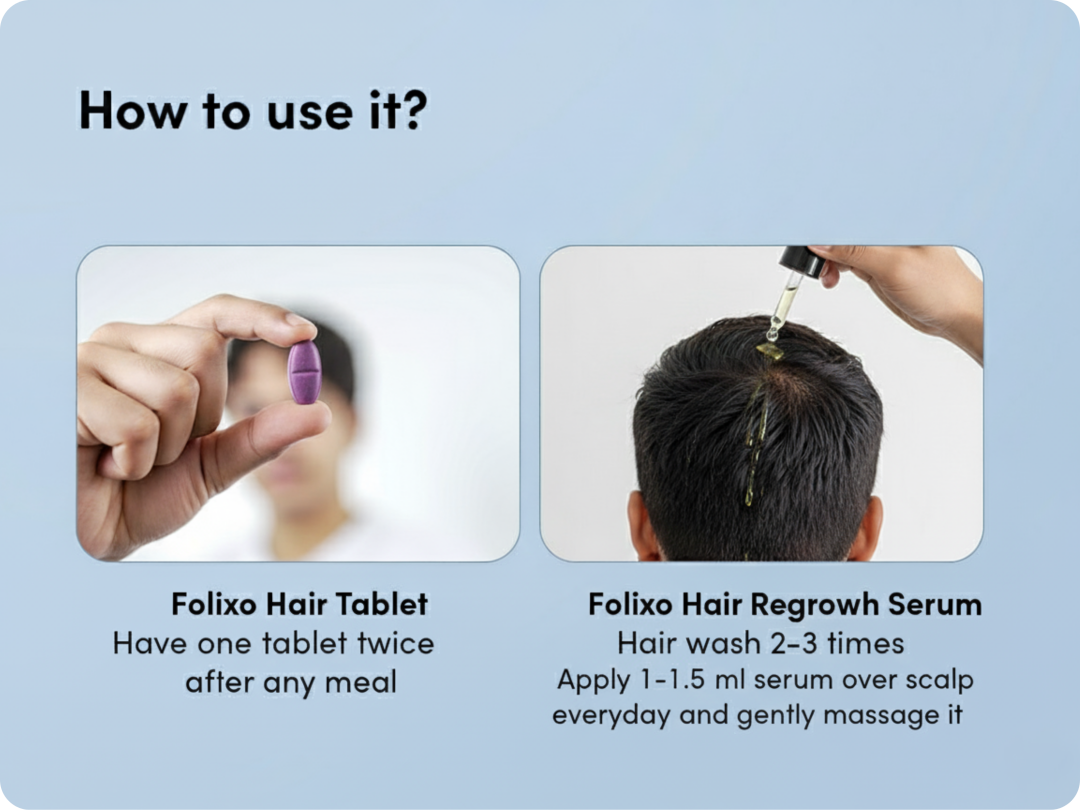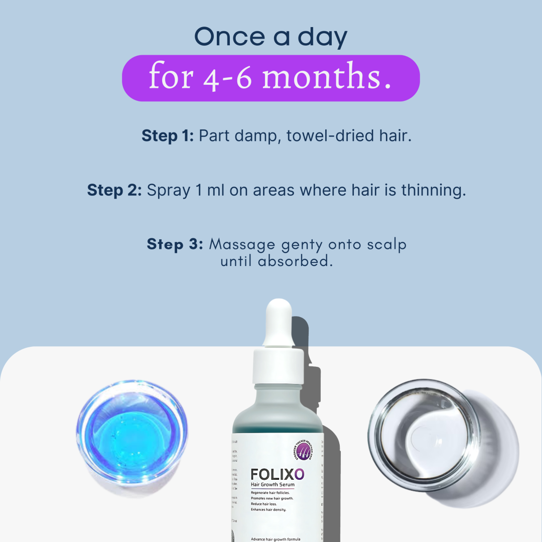 Found in Folixo Hair growth Serum help in stimulates hair follicles, prolonging the anagen phase of the hair cycle, improving blood flow and reducing hair thinning.
