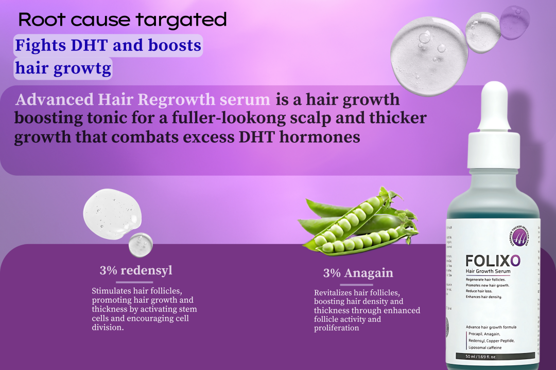 DHT shrinks hair follicles, causing thinning. Folixo serum helps reduce DHT and improves scalp blood flow.