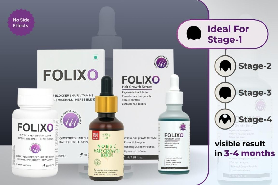 Folixo & Nobel Hair serum stimulates the scalp and boosts the process of hair growth in places where there is scanty growth. With continuous use, Serum helps in covering bald patches by improving the growth, density and thickness of hair.