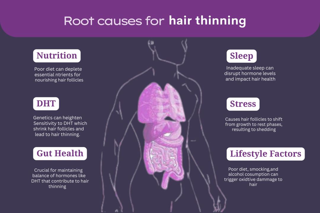 DHT shrinks hair follicles, causing thinning. Retreat-Ds helps reduce DHT and improves scalp blood flow.